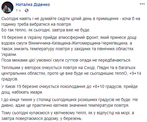 Во вторник, 19 марта, Украину накроет атмосферный фронт с дождями. Поэтому украинцам советуют сегодня провести время на воздухе. Об этом сообщила синоптик Наталья Диденко на своей странице в Facebook.