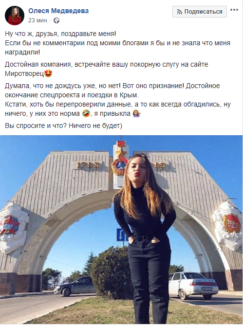 "Достойная компания, встречайте вашу покорную слугу на сайте Миротворец. Думала, что не дождусь уже, но нет! Вот оно признание! Достойное окончание спецпроекта и поездки в Крым", - пишет Медведева.