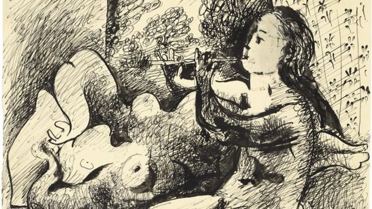 Рисунок, размер которого 26х33,3 см, называется "Флейтистка и обнаженная фигура", он датирован октябрем 1932 года и относится к сюрреалистическому периоду творчества Пикассо. Этот год, как подчеркивают эксперты, был особенно плодотворным в жизни художника.