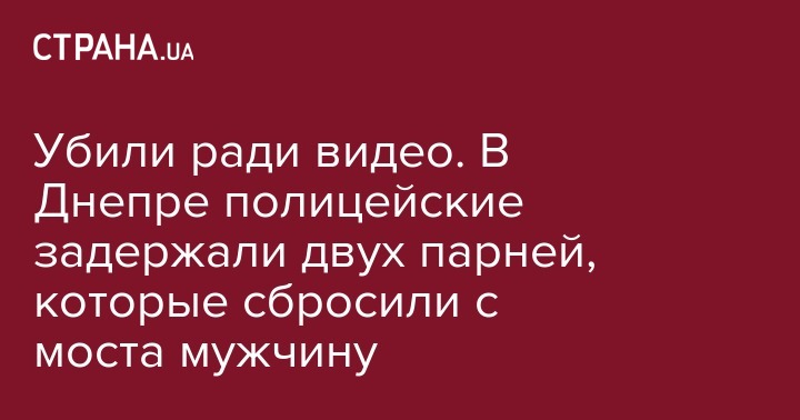 Полиция Днепра в субботу, 6 апреля, задержала двоих молодых людей, которые ради того, чтобы снять видео на телефон, избили и сбросили с моста мужчину. Об этом сообщил первый заместитель председателя Нацполиции Вячеслав Аброськин в Facebook.