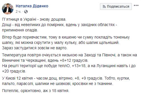 В Киеве 12 апреля прогнозируются местами дожди, ветрено, +8... +9 градусов. Диденко посоветовала брать с собой зонты, надевать куртки, пальто, шапки и шарфы. По ее прогнозу, потеплеет, ориентировочно, с 18 апреля.