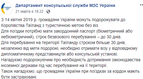 С сегодня, 14 апреля украинцы могут путешествовать в Таиланд с туристической целью без виз. Об этом в Facebook сообщает Департамент консульской службы МИД Украины.
