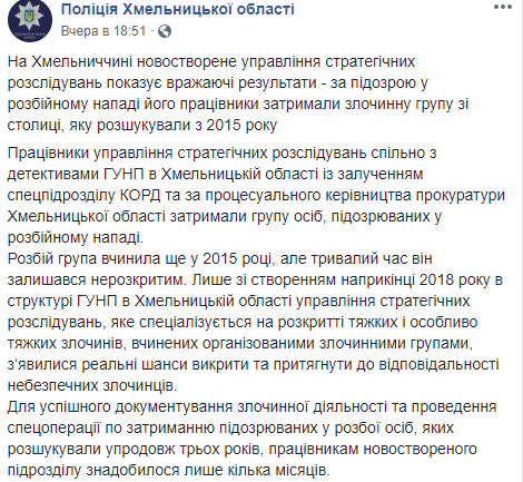 В сообщении полицейских говорится, что группа совершила разбой еще в 2015 году, но долгое время он оставался нераскрытым. Только с созданием в конце 2018 года в структуре Главного управления Нацполиции в Хмельницкой области управления стратегических расследований, которое специализируется на раскрытии тяжких и особо тяжких преступлений, совершенных организованными преступными группами, появились реальные шансы разоблачить и привлечь к ответственности опасных преступников. Для успешного документирования преступной деятельности и проведения спецоперации по задержанию подозреваемых в разбое лиц, которых разыскивали в течение 3 лет, работникам подразделения понадобилось всего несколько месяцев. Все задержанные - жители Киева в возрасте 45-49 лет. Один из них является столичным криминальным авторитетом.