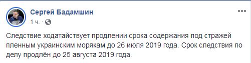 Кроме того, защитник отметил, что следствие ходатайствует о продлении срока содержания под стражей военнопленным украинским морякам до 26 июля текущего года. "Срок следствия по делу продлен до 25 августа 2019 года", - написал он. Отметим, что 24 августа Украина отмечает свой день независимости