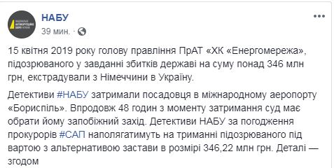 Отмечается, что Крючкова, экстрадированного в Украину из Германии, задержали в международном аэропорту "Борисполь". Он подозревается в нанесении ущерба государству на сумму свыше 346 млн грн, экстрадировали из Германии в Украину. "Детективы НАБУ задержали чиновника в международном аэропорту "Борисполь". В течение 48 часов с момента задержания суд должен избрать ему меру пресечения", - сказано в сообщении Нацбюро.
