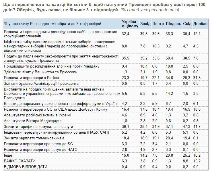 На вопрос "Что из перечисленного в карточке Вы хотели бы, чтобы следующий президент сделал в свои первые 100 дней? Выберите не более 3-х ответов", ответы респондентов распределились следующим образом (в целом по Украине):