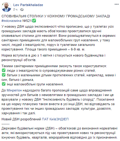 В новые Государственные строительные нормы, вступившие в силу с 1 апреля, включено обязательство оборудовать общественные здания пеленальными столиками для младенцев. Об этом на своей странице в соцсети сообщил заместитель министра регионального развития Лев Парцхаладзе.