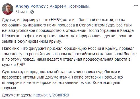 Национальное антикоррупционное бюро Украины (НАБУ) начало уголовное производство в отношении посла в Канаде Андрея Шевченко за продажу в Крыму принадлежавшей ему земли по российским законам. Об этом в Facebook сообщил юрист Андрей Портнов, по заявлению которого суд и обязал НАБУ начать расследование по этому факту.