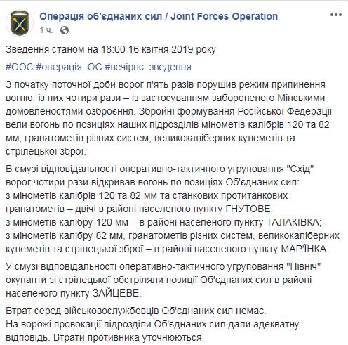 Во вторник, 16 апреля, противник пять раз нарушили "режим тишины" в районе проведения операции Объединенных сил на Донбассе. В том числе четыре раза с применением запрещенного минскими договоренностями вооружения, передает пресс-центр штаба ООС на странице в Facebook.