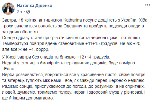 В четверг, 18 апреля, антициклон Katharina прогонит дожди из Украины, осадки могут зацепится в Одесской области и пройти местами в западных областях. Об этом сообщает синоптик Наталья Диденко на своей странице в Facebook.