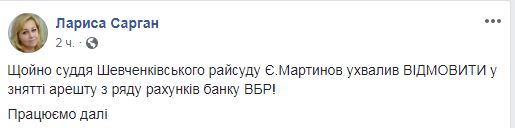 "Только что судья Шевченковского райсуда Е.Мартынов постановил отказать в снятии ареста с ряда счетов банка ВБР", – сообщила Сарган.