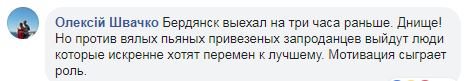 "Бердянск выехал на три часа раньше. Днище! Но против вялых пьяных привезеных запроданцев выйдут люди которые искренне хотят перемен к лучшему. Мотивация сыграет роль", - написал Алексей Швачко.