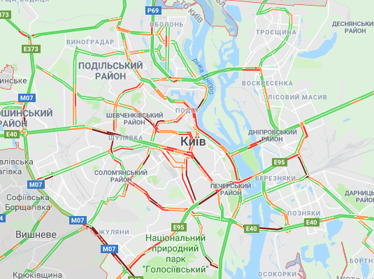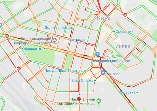 В пятницу, 19 апреля, на дорогах Киева наблюдается затрудненное движение. Вероятно, это связано с перекрытием некоторых улиц из-за подготовки к массовому вечернему мероприятию на НСК "Олимпийский". О заторах свидетельствуют данные онлайн-сервиса Google Maps. По состоянию на 13:00 тянучка образовалась на проспектах Победы, Генерала Ватутина, Голосеевском, Героев Сталинграда, Леся Курбаса, Валерия Лобановского и Николая Бажана, а также на улицах Крещатик и Борщаговской. Улицы Вадима Гетьмана и Академика Туполева перекрыты.