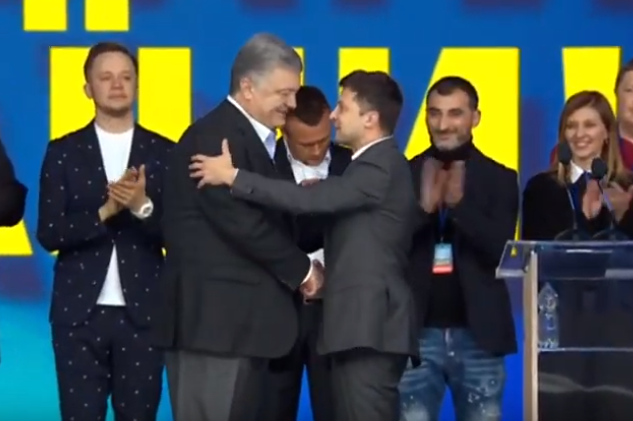 Во время дебатов на НСК "Олимпийский" вечером 19 апреля Петр Порошенко вышел на сцену к своему оппоненту Владимиру Зеленскому и пожал ему руку.