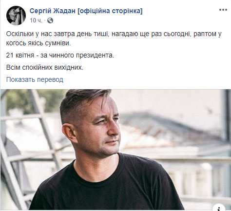 "Поскольку у нас завтра "день тишины", напомню еще раз сегодня, вдруг у кого-то какие-то сомнения. 21 апреля – за действующего президента", - написал он на своей странице в соцсети Facebook.