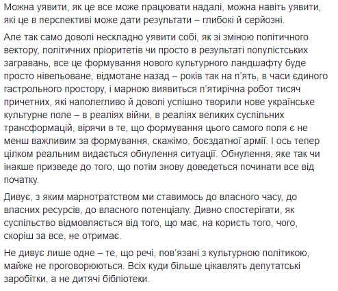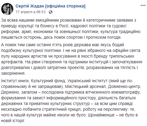 "На уровне создания и поддержки институтов и начала длительных и довольно затратных проектов, рассчитанных на преемственность и укоренение. Институт книги, Культурный фонд, Украинский институт (который еще по-настоящему и не заработал), Мистецький арсенал, Довженко-центр, Госкино, в общем – последовательная поддержка отечественного кинематографа, формирование и защита информационного пространства, деятельность многих государственных и частных культурных структур – по всему этому действительно несложно увидеть стратегический прицел, работу на перспективу: то, чего в нашей культуре почти никогда не было. По меньшей мере - не было в новой истории", - написал Сергей Жадан.