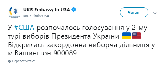 В США тоже началось голосование на выборах президента Украины. Об этом в Twitter сообщает посольство Украины.