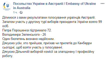 Так, всего во втором туре выборов президента Украины в Австралии приняли участие 99 человек. Петра Порошенко поддержали 72 избирателя, Владимира Зеленского – 26 человек. Один бюллетень признан недействительным.