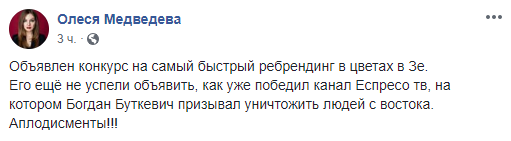 "Объявлен конкурс на самый быстрый ребрендинг в цветах в Зе. Его ещё не успели объявить, как уже победил канал Еспресо тв, на котором Богдан Буткевич призывал уничтожить людей с востока. Аплодисменты!!!", - написала на своей странице в Facebook ведущая блога ЯсноПонятно на "Стране" Олеся Медведева.