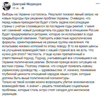 Премьер-министр России. Дмитрий Медведев Выразил надежду на улучшение отношений между Москвой и Киевом, но при этом заявил, что новый президент должен учитывать реалии на юго-востоке Украины. Об этом Медведев написал в Facebook.