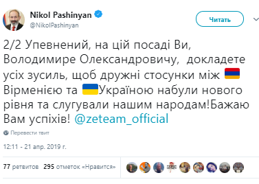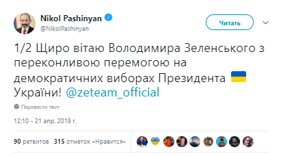 Премьер-министр Армении Никол Пашинян поздравил Владимира Зеленского с победой на выборах. Любопытно, что свое поздравление в Twitter армянский премьер написал на украинском языке.
