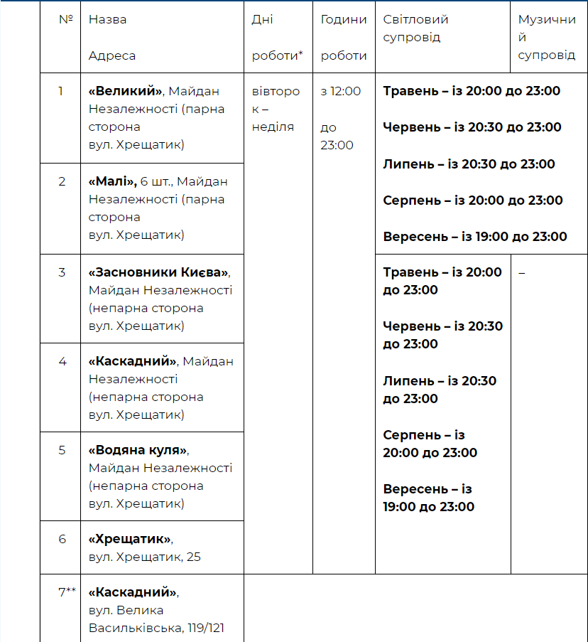 Как и в предыдущие годы, 2 фонтанные комплексы будут работать в режиме светло-музыкального шоу - это фонтаны "Большой" и "Малые" на Майдане.