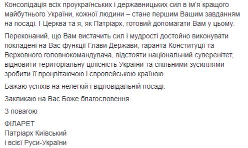 Филарет опубликовал в Facebook большой пост-поздравление Зеленского