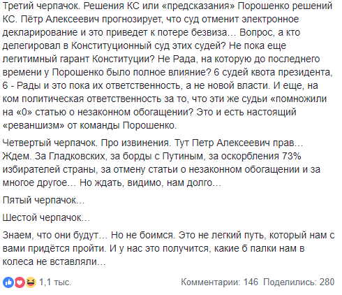 Третий черпачок. Решения КС или "предсказания" Порошенко решений КС. Пётр Алексеевич прогнозирует, что суд отменит электронное декларирование и это приведет к потере безвиза… Вопрос, а кто делегировал в Конституционный суд этих судей? Не пока еще легитимный гарант Конституции? Не Рада, на которую до последнего времени у Порошенко было полное влияние? 6 судей квота президента, 6 - Рады и это пока их ответственность, а не новой власти. И еще, на ком политическая ответственность за то, что эти же судьи "помножили на "0" статью о незаконном обогащении? Это и есть настоящий "реваншизм" от команды Порошенко.