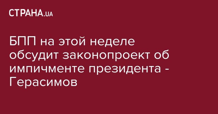 Партия БПП снова соберется на заседание на этой неделе для обсуждения законопроекта, который предполагает импичмент президента. Об этом сообщил руководитель фракции Артур Герасимов, передает Интерфакс-Украина
