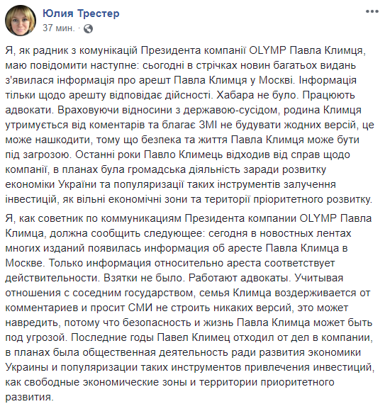 "Как советник по коммуникациям президента компании OLYMP Павла Климца, должна сообщить следующее: сегодня в лентах новостей многих изданий появилась информация об аресте Павла Климца в Москве. Информация только об аресте соответствует действительности. Взятки не было. Работают адвокаты. Учитывая отношения с государством-соседом, семья Климца воздерживается от комментариев и умоляет СМИ не строить никаких версий, это может навредить, потому что безопасность и жизнь Павла Климца может быть под угрозой. Последние годы Павел Климец отходил от дел в отношении компании, в планах была общественная деятельность ради развития экономики Украины и популяризации таких инструментов привлечения инвестиций, как свободные экономические зоны и территории приоритетного развития", - написала Юлия Трестер.