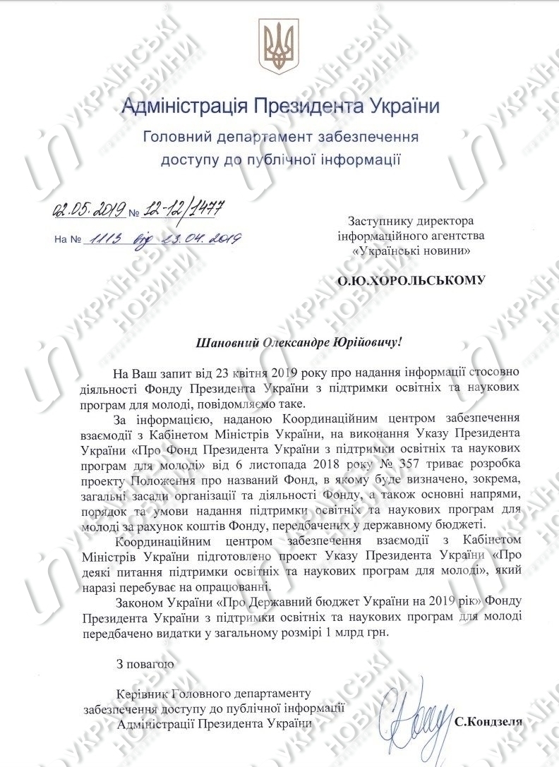 "По информации, предоставленной Координационным центром обеспечения взаимодействия с Кабинетом Министров Украины, во исполнение указа президента Украины "О Фонде президента Украины по поддержке образовательных и научных программ для молодежи" от 6 ноября 2018 года №357 продолжается разработка проекта Положения о названном фонде, в котором будет определено, в частности, общие принципы организации и деятельности фонда, а также основные направления, порядок и условия предоставления поддержки образовательных и научных программ для молодежи за счет средств фонда, предусмотренных в государственном бюджете", - сказано в документе.