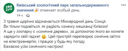 Несмотря то, что вечером в пятницу, 3 мая, столицу накрыл мощный ливень с градом, животные в Киевском зоопарке успели отметить Всемирный день Солнца. Об этом сообщает пресс-служба зоопарка на странице в Facebook.