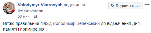"Поздравляю правильный подход Владимира Зеленского к Дню памяти и примирения", - написал он и поделился публикацией нового президента в Facebook.