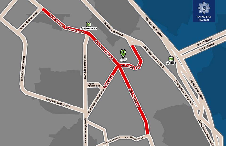 - улица Ивана Мазепы - от станции метро "Арсенальная" до площади Славы;