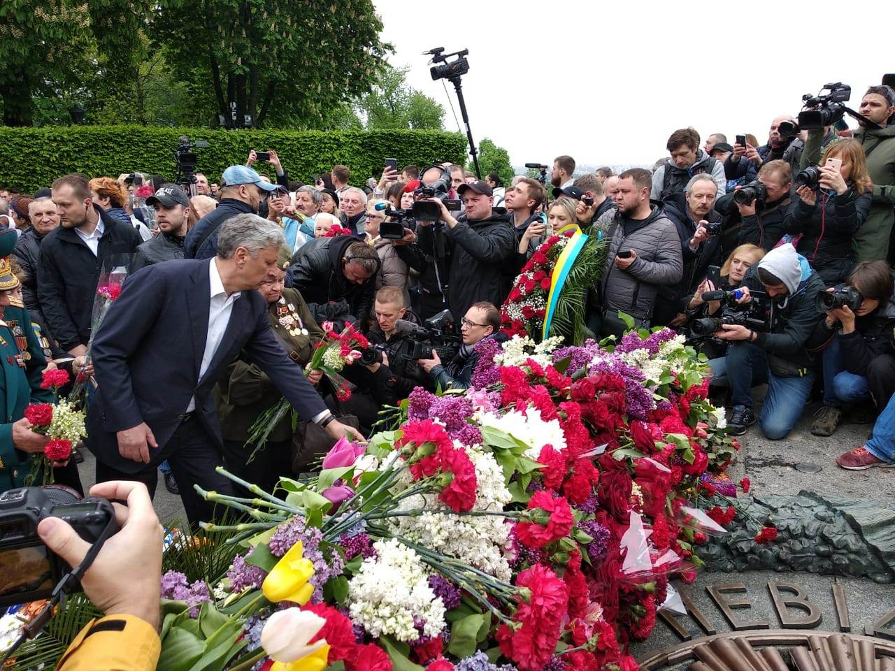 9:39 Порошенко раньше всех пришел к Вечному огню, возложил цветы и уехал. Все происходило под траурную музыку. Вместе с президентом приехал премьер Владимир Гройсман и глава ПЦУ Епифаний.