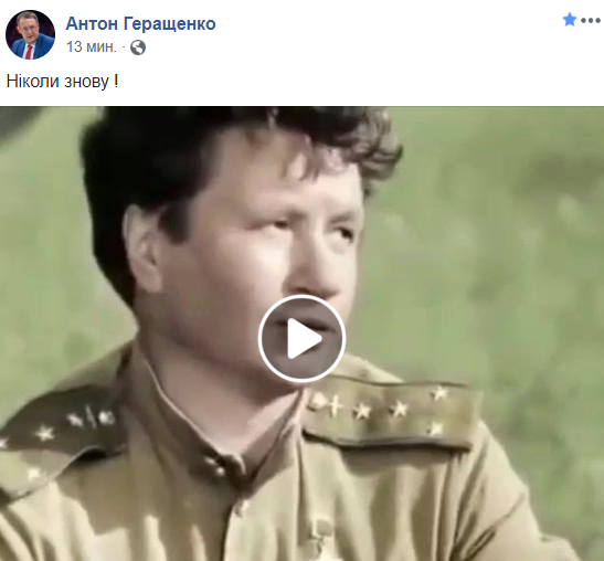 12:02 Создатель "Миротворца" Антон Геращенко, который в последнее время дрейфует от радикальной риторики и хвалит Владимира Зеленского, опубликовал в Facebook отрывок из фильма "В бой идут одни старики".