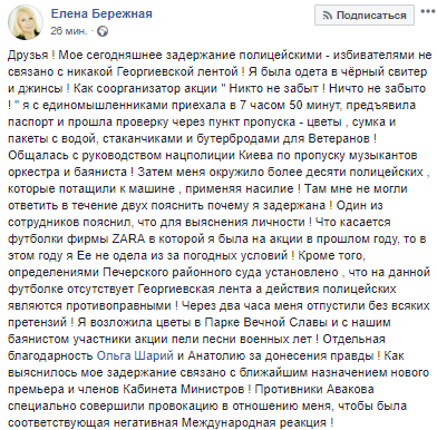 "Что касается футболки фирмы ZARA, в которой я была на акции в прошлом году, то в этом году я ее не одела из-за погодных условий! Кроме того, определениями Печерского районного суда установлено, что на данной футболке отсутствует георгиевская лента, а действия полицейских являются противоправными! Через два часа меня отпустили без всяких претензий! Я возложила цветы в Парке Вечной Славы и с нашим баянистом участники акции пели песни военных лет!" - пишет Бережная.