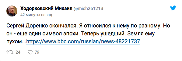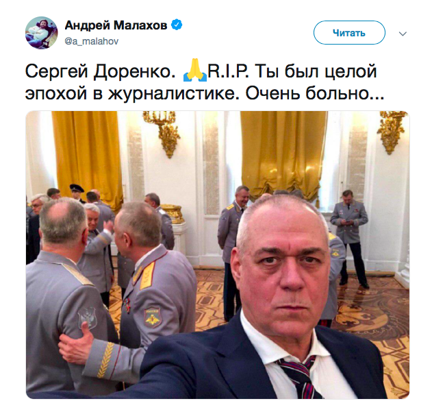 "Сергей Доренко скончался. Я относился к нему по-разному. Но он - еще один символ эпохи. Теперь ушедший. Земля ему пухом..."