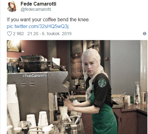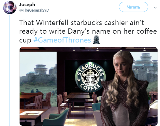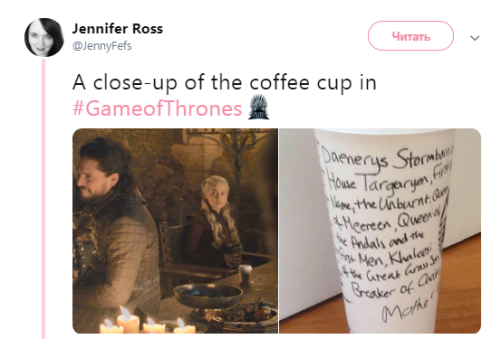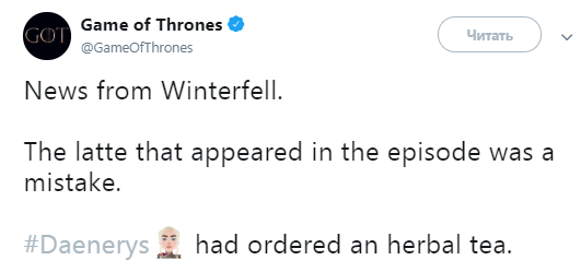 Представители НВО также отшутились в Twitter, написав, что чашка Starbucks оказалась в кадре по ошибке, ведь Дейенерис заказывала травяной чай.