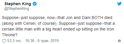 После выхода четвертой серии поклонники обсуждали и прогноз концовки сериала от одного из его известных поклонников - автора романов ужаса Стивена Кинга. Он предположил, что Дейенерис и Джон Сноу могут погибнуть во время битвы в Королевской гавани. А Железный Трон освободится для Тириона Ланнистера.