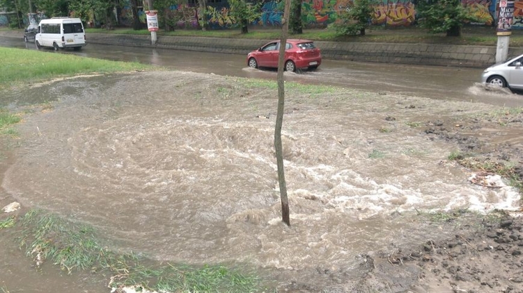 Прорыв произошел около 13:00, вода продолжает заливать бульвар и пешеходную зону проспекта. Фонтан бьет на месте известной городской "Садовой низины" - самой низкой, относительно уровня моря, точке города.