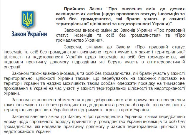 Ранее действующий состав парламента принял закон "О внесении изменений в некоторые законодательные акты (относительно правового статуса иностранцев и лиц без гражданства, которые принимали участие в защите территориальной целостности и неприкосновенности Украины)".