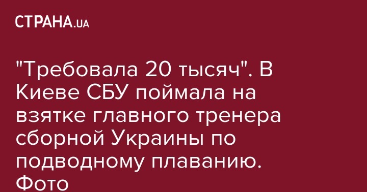 Сотрудники Службы безопасности Украины задержали главного тренера Национальной сборной команды Украины по подводному спорту и подводной деятельности во время получения ею взятки в 20 тыс. гривен. Об этом в пятницу, 7 июня, сообщает пресс-служба СБУ.