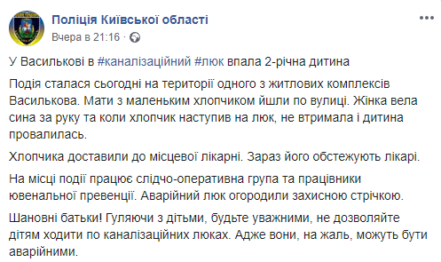 Отмечается, что происшествие произошло на территории одного из жилых комплексов Василькова. Маленький ребенок вместе с матерью шел по улице. Женщина держала малыша за руку, однако, когда он наступил на крышку люка, не удержала и ребенок провалился.