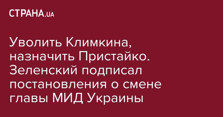 Президент Украины Владимир Зеленский подписал представление об увольнении Павла Климкина с должности министра иностранных дел страны. Кроме того, он внес в Верховную Раду представление на назначение главой МИД Вадима Пристайко