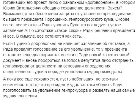 Он объясняет, что Рада не сможет уволить генпрокурора по основаниям, изложенным в представлении президента. "И о том, что внесение в парламент "непроходного" документа свидетельствует либо о некомпетентности сотрудников АП, готовивших его проект, либо о банальном "договорняке", в котором Юрию Витальевичу обещано сохранение должности. Зачем? Возможно, для обеспечения защиты от уголовного преследования бывшего президента Порошенко, генпрокурорского кума. Скорее всего, после отказа Рады уволить Луценко последует пустое заявление АП о саботаже "такой-сякой" Рады решений президента. И все. В смысле, все останется как есть", - считает юрист.