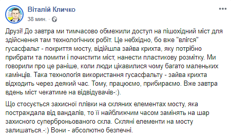 "Что касается защитной пленки на стеклянных элементах моста, пострадавшего от вандалов, то ее в ближайшее время заменят на слой защитного суперброированного стекла. Стеклянные элементы на мосту останутся. Они - абсолютно безопасны", - написал Кличко.