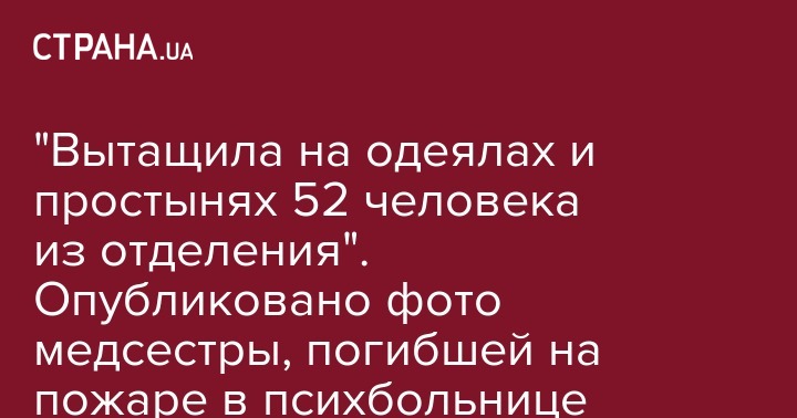 Медсестра, которая погибла в результате пожара в психбольнице Одессы 11 июня, на себе вынесла из отделения №7 52 человека. Об этом в Facebook сообщила глава благотворительного фонда "Корпорация монстров" Екатерина Ножевникова.