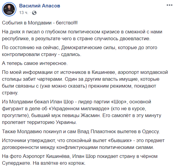 "Из Молдавии бежал Илан Шор - лидер партии "Шор", основной фигурант в деле об "Украденном миллиарде", бывший муж певицы Жасмин. Его самолёт в эту минуту пролетает территорию Украины.