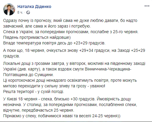 "В столице, по предварительным прогнозам, ослабление жары, ощутимо, предполагается 25 июня. Ныряем в жару, увидимся живые и веселые 24-25 июня", - написала Диденко.